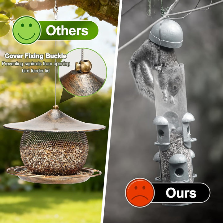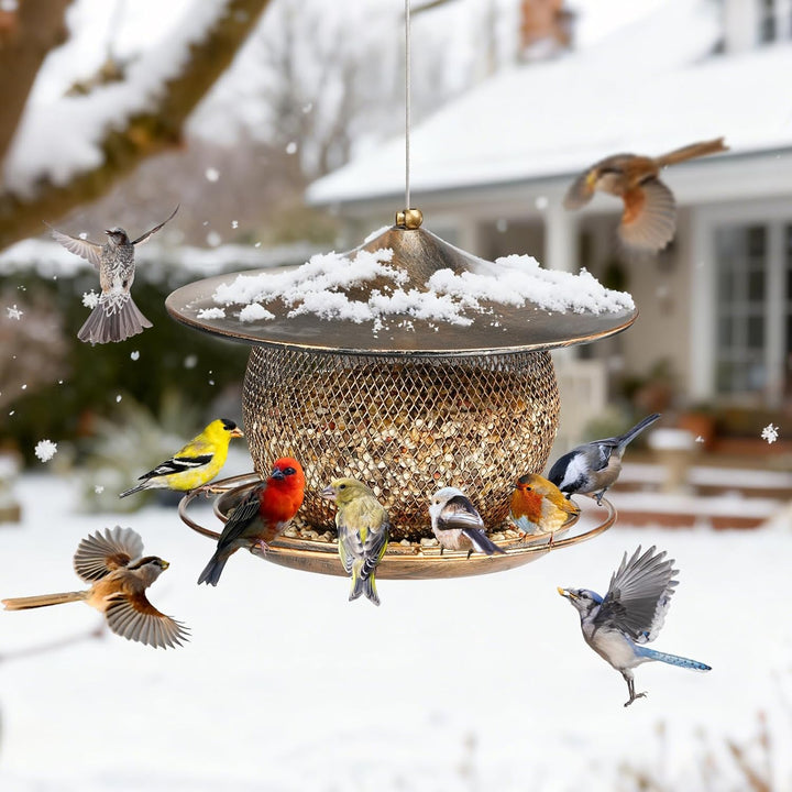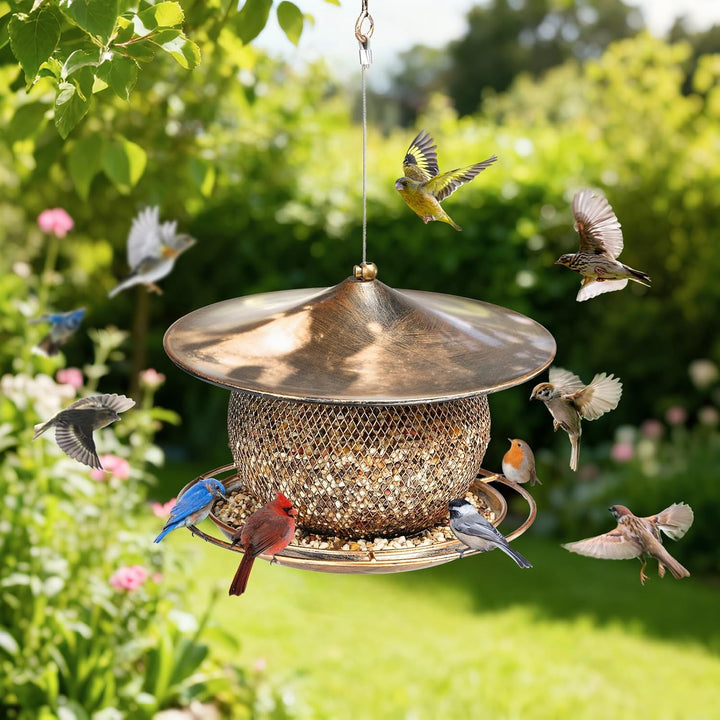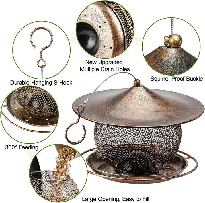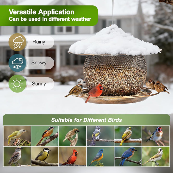 This bird feeder features an enlarged eave diameter to withstand heavy winter snow and summer rain, ensuring seeds remain dry. The distance between the roof and perch has been precisely calculated to accommodate most birds for resting. Constructed from durable, high-quality heavy-duty metal, the feeder is coated with rust-resistant paint and finished with a vintage brushed texture. The tray features drainage holes to promptly remove accumulated water, keeping birdseed dry.